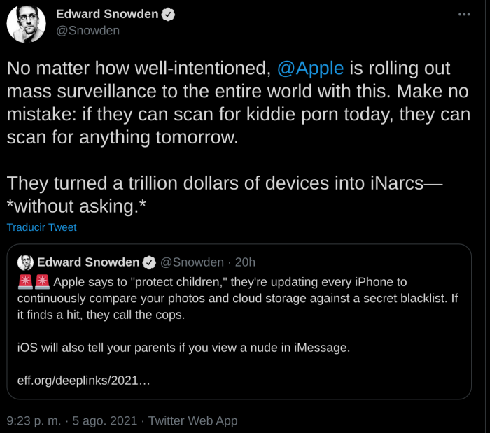 Aunque Apple trate de amortiguar su anuncio diciendo que estas nuevas medidas son compatibles con la privacidad porque funcionan del lado del cliente (es decir, en el propio dispositivo de las personas y no en los servidores de la compañía) y que se limita a un tipo específico de datos (en este caso imágenes que puedan afectar la integridad de menores de edad), el problema es la dificultad para garantizar y mantener esos límites. Un sistema así puede ser fácilmente abusado por la misma compañía o peor aún, por un gobierno autoritario para buscar otro tipo de datos dentro de dispositivos altamente sensibles, que revelan por ejemplo a fuentes de periodistas, inclinaciones sexuales o preferencias políticas.