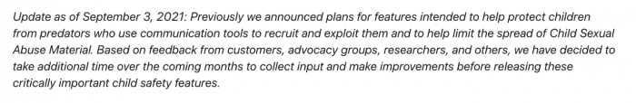 El 3 de septiembre de 2021, la compañía Apple anunció en su página de Child Safety que aplazaba el lanzamiento de las características mencionadas en este texto, basada en la retroalimentación recibida por parte de clientes, grupos de activistas, investigadores y otros. Solo mientras recibe más aportes y hace mejoras antes de implementar el sistema oficialmente.