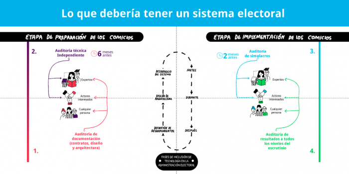 En este esquema se muestra cómo hay diferentes tipos de auditorías y actores participando, ya sea en la preparación del sistema o en su implementación. La etapa de preparación incluye las fases de definición de requerimientos, diseño de arquitectura y desarrollo del sistema para los comicios. Sobre la columna derecha del diagrama tenemos la etapa de implementación de este diseño tecnológico que sucede en las fases de simulación antes del día de las elecciones, durante la votación y, finalmente, después de la consolidación y publicación de resultados oficiales.