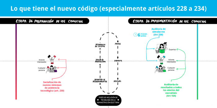 El proyecto de reforma incluye una “auditoría de sistemas” (art. 236) que se hace desde seis meses antes de la elección y prevé la socialización de los sistemas cada vez que se va a implementar cualquier sistema de asistencia tecnológica (art. 230). Además, se establecen requerimientos para la entrega de resultados oficiales en el escrutinio y una plataforma de fiscalización (art. 164). Adicionalmente, se propone que el código del software de escrutinios sea propiedad de la Registraduría y de código abierto.